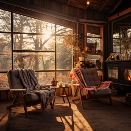 Sony a7iii photograph of cozy natural modern cabin interior made from reclaimed wood and rusty corten steel, cozy chairs with soft blankets, afternoon light --v 5.2