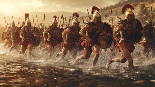 Hoplites crossing a river under heavy fire, arrows piercing the water, soldiers falling, desperation in the air. Hyper Realistic HD photos --v 6.1 --ar 16:9