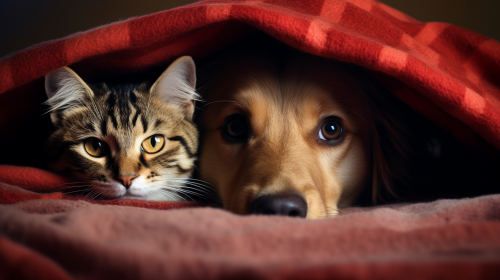 Dog and cat together peeking out of a blanket, sharp, detailed, copy space --ar 16:9