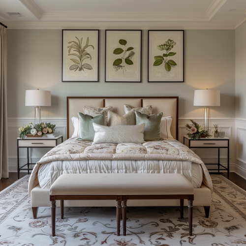A luxurious bedroom with a serene and elegant design, featuring a large, upholstered bed with a cream-colored headboard trimmed in dark wood. The bed is flanked by two matching nightstands, each adorned with a table lamp and delicate floral arrangements. Behind the bed are three large, framed botanical prints that add a touch of nature and sophistication. The walls are painted in a soft, muted gray, complemented by white crown molding and wainscoting. The room is anchored by a plush, light-colored area rug, and two upholstered benches sit at the foot of the bed, adding to the refined and tranquil atmosphere. The overall ambiance is classic, calm, and inviting. --v 6.0