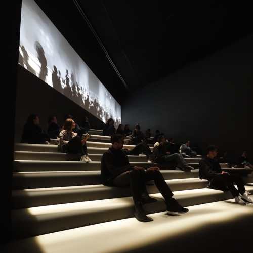contemporary movie theater playing old film, dark blue textile walls, dark purple seats, linear lights cealing, --ar 16:9