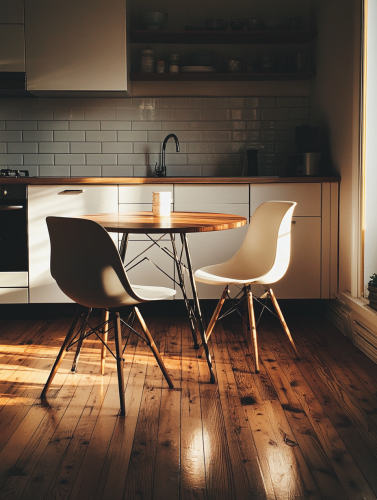A small, round table with two chairs in the kitchen, a wooden floor, and modern white furniture create a cozy atmosphere. The evening light adds to the Scandinavian-style ambiance. The photo was taken with an iPhone 5s camera and posted on Reddit or Snapchat, capturing a candid moment. --ar 3:4