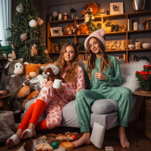female models wearing knit loungewear in a cozy interior setting, room with christmas decoration, overall color in warm tone