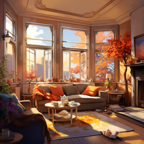 A cozy living room with a fireplace, comfortable armchairs, and shelves filled with books, Side view, deep color, pop art, 32K, high detail
