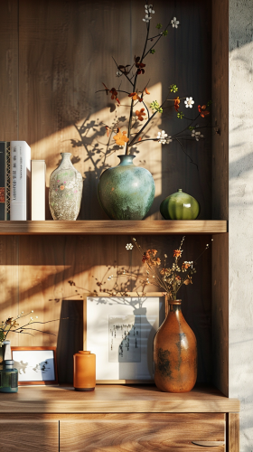 Create a photorealistic image of a living room shelf or furniture piece, meticulously arranged with various decorative items. The composition should display an intentional and harmonious design, featuring elements such as vases, books, photo frames, and small plants, to evoke a warm and inviting atmosphere. Each item should be distinct, contributing to the overall aesthetic and sense of balance. This image is intended for a website landing page, necessitating a format that is considerably taller than it is wide, to gracefully fit into the site's layout while engaging visitors with its detail and realism. --v 6.0 --ar 9:16