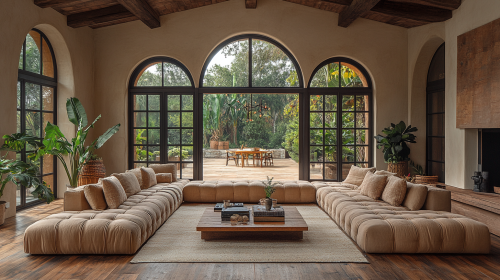 A large mid-century living room with arched windows, a fireplace, and couches, featuring rustic home decor. The room has wooden floors, a rustic chandelier, and warm lighting, creating a cozy atmosphere. The color palette is earthy, with greenery plants and a coffee table. In the background, there is a dining area with natural light. --ar 16:9 --v 6.1 --s 750