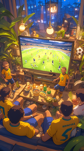 A cozy living room with a vintage television set showing a live broadcast of a Club América soccer match, depicted in detailed Japanese anime style. The TV screen displays the vibrant colors of the team's yellow and blue uniforms as the players move swiftly across the field. The living room is warmly lit, with a soft glow coming from a nearby lamp, and the furnishings are comfortable, with a plush sofa and a coffee table scattered with snacks and drinks. The scene captures a typical home setting, where fans gather to watch the game, evoking a sense of excitement and anticipation --ar 9:16 --stylize 1000 --niji 6