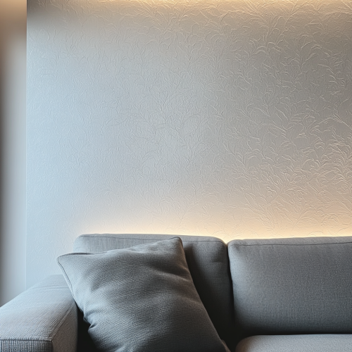 Create a cozy living room interior where 80% of the image is filled with a close-up view of a smooth, white wall. The wall should be evenly lit with warm, diffused lighting to create a comfortable and inviting space. In the background, near the edge, add a blurred hint of a low, round coffee table in light wood with a small, soft-glow lamp or a simple decorative item like a vase or book stack, positioned out of focus. The floor should have a soft, neutral-toned rug to enhance warmth without taking away from the wall.