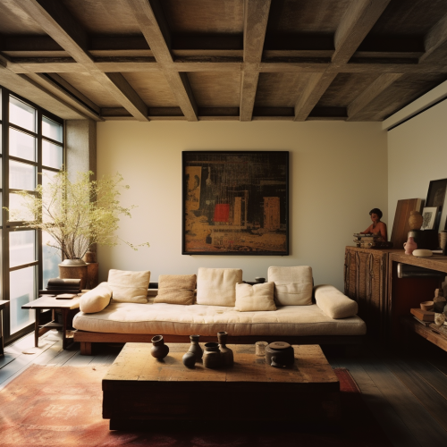 American country living room, wall-mounted fireplace, large floor-to-ceiling windows, acoustic guitar, clear details --ar 16:9