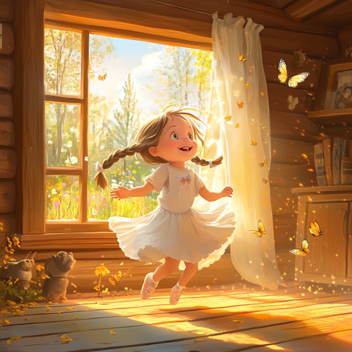 A warm log home style, a little girl with cute butterfly braids, the breeze blows up the screen window, the sun shines in, the little girl in a white skirt runs by with a cute smile, real people and scenes