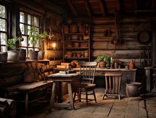 rustic log cabin interior wall no windows blanc wall primitive furnishings photo realistic --ar 4:3 --s 250