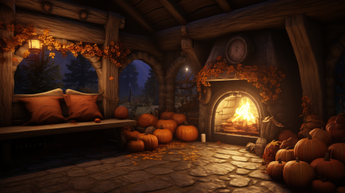 cozy realistic high-quality hobbit autumn cabin fireplace,pumpkins, string lights, orange and purple warm lights, realistic, unreal engine 5 --ar 16:9