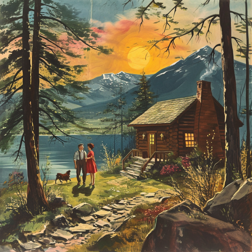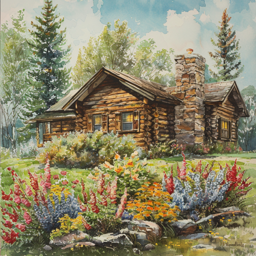 A cozy log cabin nestles in a clearing, surrounded by towering pine trees and a winding stream under a warm, fading colorful evening light,in the style of Studio Ghibli illustrations, with an anime art style, digital painting, oil paint, high resolution, detailed, concept art, digital art, pixel art, wide-angle shot, cinematic, low perspective, side view, fantasy artwork, 2D game graphics, lo-fi aesthetic, pastel colors, hyper-realistic, cinematic, Octane render, Unreal Engine 5. --ar 4:5 --s 500