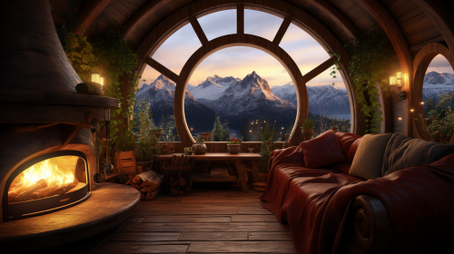 wooden stove + fabric sofa with pillows + big beautiful window, cozy evening winter cabin interior, ultra photorealistic + 8k + cinematic + very realistic, unreal engine 5, 3d max render --ar 16:9 --s 50