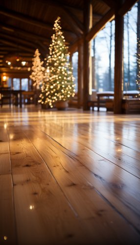 desk area by fireplace in great room of cabin, daylight, dark floor