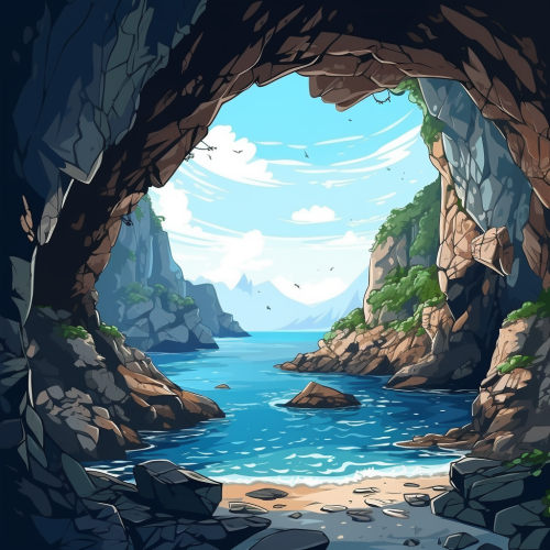 the entrance to a deep and dark cave in a cliff of rocks, small sea view, cartoon style