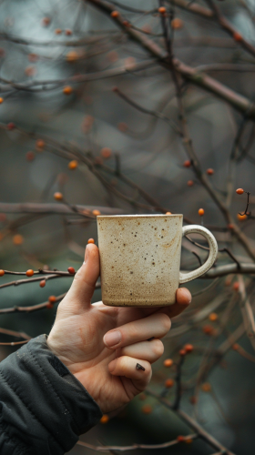 light mixed race hand holding a coffee cup, in the style of code-based creations, applecore, tabletop photography, light white and dark gray, website, letterboxing, cabincore --aspect 9:16