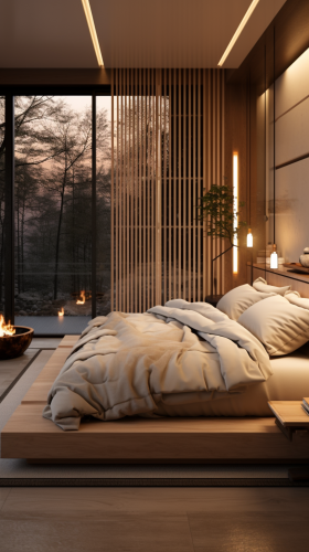 Create a highly realistic image of a cozy bedroom. The room should feature soft lighting, with warm tones and natural elements. Include a plush bed with layered blankets and pillows, a bedside table with a small lamp emitting warm light, and personal touches like a book, candle, or a cup of tea. The walls can have subtle textures, art, or soft neutral colors. A large window with light curtains allows natural light to gently filter in, adding to the inviting atmosphere. Use elements like a rug, plants, and wooden furniture to enhance the comfort and warmth of the space. The overall mood should evoke relaxation, serenity, and coziness. No text should be included. --ar 16:9 --v 6.0 --s 750