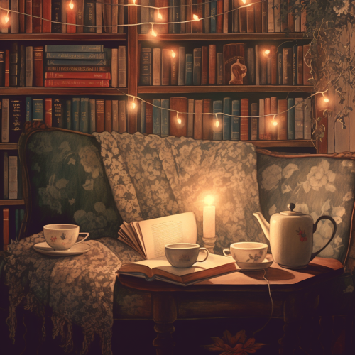 a quiet, cozy corner in a bookstore, charming, moody, illustration style, reading light on a table, soft cream blanket over the arm of a char, mug of tea next to an open book, shelves full of books in the background, book nook, stained glass window, fairy lights, --no windows, ar 9.3:8.2