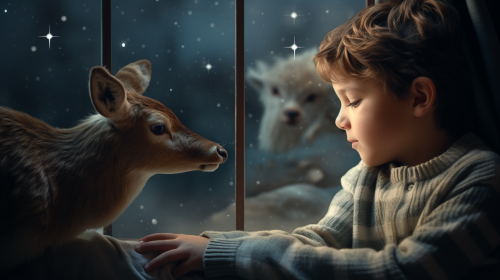 Baby boy rubbing his eye with hand, is tucked into bed, a gentle glow filled his room, in front of small boy a baby reindeer is seen with a very bright nose, seeing town through the window, christmas theme, night, studio lights::3 --aspect 16:9