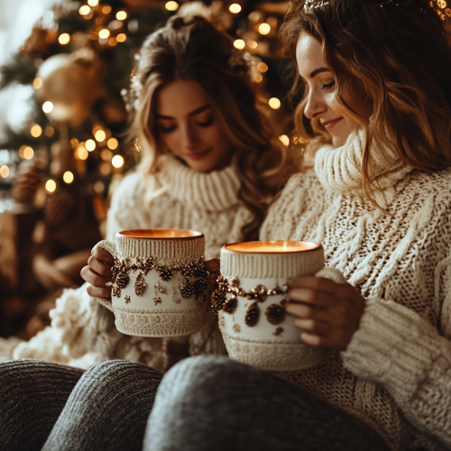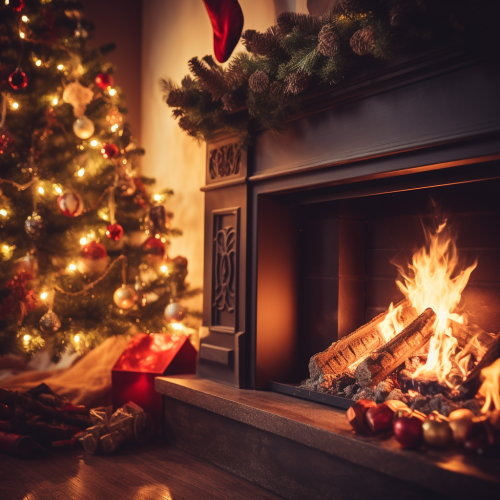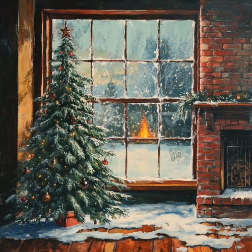 holiday feelings cheer and love and goodwill hightly stylized evergreen tree artwork cold and frosty windowpane with red brick hearth and fireplace inside