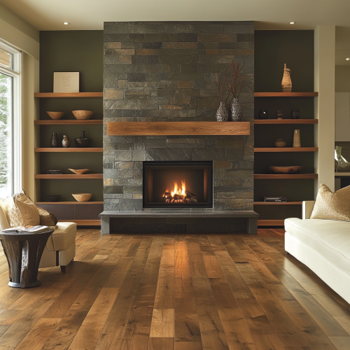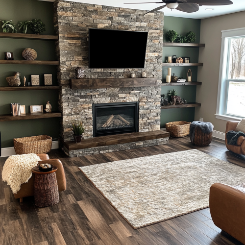 A living room that is 22' x 13' with a fireplace surrounded natural grey stone of random sizes from floor to ceiling on the 13' wall with 3' dark brown shelving on both sides. The wood floors are wide plank, chestnut brown. The mantal above the fireplace is matches the floor color. Walls are a midnight green. On one wall is an olive green console that is the full length of the wall. Room decor is ivory, bronze, gold with some chestnut brown furnitire. Mix modern and traditional styles.