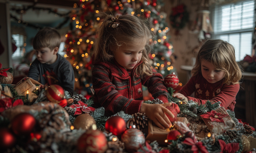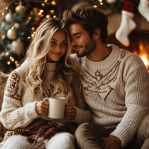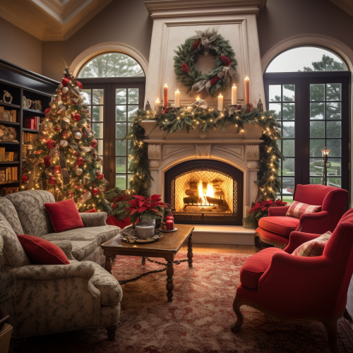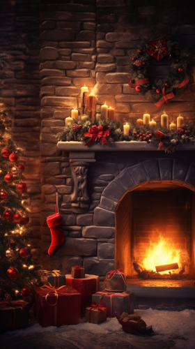 create a high resolution image of a cozy home living room decorated for Christmas. Photo should be taken as a portait zoomed in on the fireplace mantle.