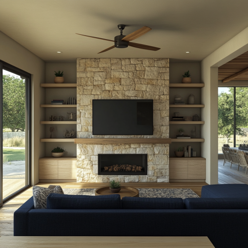 ultra realistic modern living room with stone fireplace, white oak wall shelf and dark blue couch, neutral color scheme, large tv on the back wall above wood shelves, sliding glass door to patio area, ceiling fan in middle of ceiling, natural light from windows, 20x5 foot space between TV & sofa