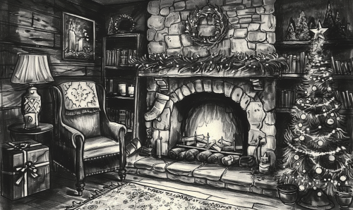 a black and white sketch of a cozy christmas fireplace scene. Artistic. Creative. Dynamic. --ar 5:3
