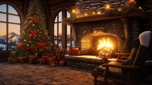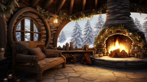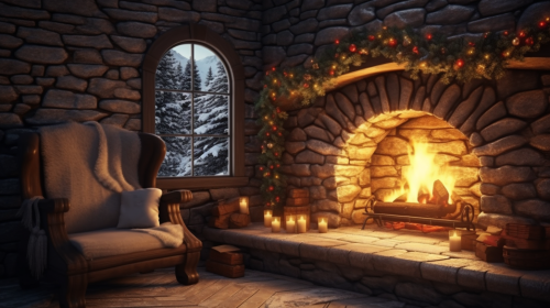 3d realistic 8k warm cozy stone winter fireplace inside a hobbit house, big window on the right, big armchair on the right, night, carpet, candles, warm atmosphere, christmas tree and christmas decoratuins, very realistic, unreal engine 5 --ar 16:9 --s 50