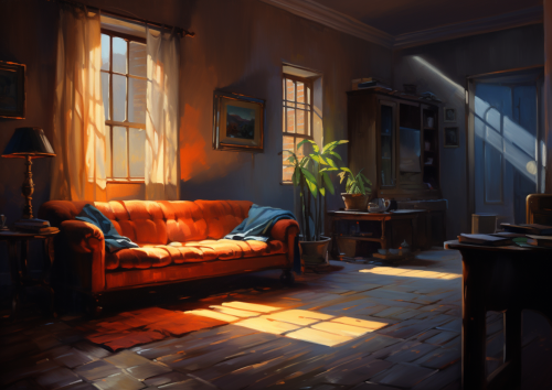 cozy lowkey interior painting by simon adjiashvili,, dramatic lighting, rays of light, shadowplay, depth, artistic composition, --ar 7:5