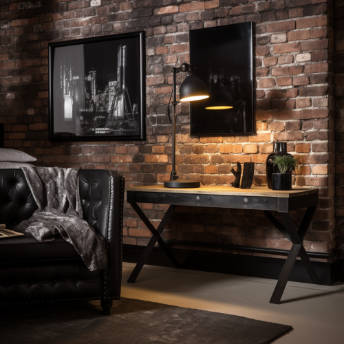 dark loft style, brick wall, dark floor, metal furniture finishes, bedside lamp. in the focal point on the wall a photo frame of 50 x 70 cm