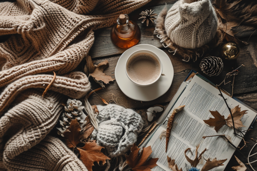 Close-up of a couple’s hands holding mugs in a cozy winter setting by a fireplace. Only the hands and mugs are visible, with no faces or identifiable people in the frame. The scene is softly lit by the warm glow of the fire, with hints of Christmas decorations and candles in the background for a festive, intimate atmosphere. Focus on the texture of the sweaters and the warmth of the moment, with a gentle bokeh effect to enhance the cozy feel --style raw --s 750