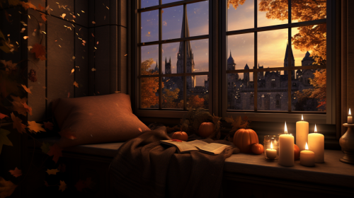3d detailed cozy evening after autumn rain Hogwarts view from big Hogwarts reading nook on a window seat, Hogwarts reading nook, Halloween decorations, window seat with pillows, autumn leaves, pumpkins, very sharp, 8k, wide angle, unreal engine 5 --ar 16:9 --s 50