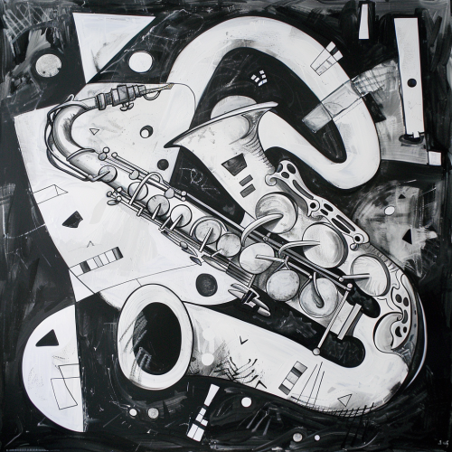 goofy saxophone new jazz in style of kandinsky painting upside down left right amogus black and white bugulma --s 50