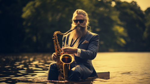 a saxophonist old with a beard jazz guy in a suit on the raft on the river. he is wearing a suit and dark sunglasses. Cinematic, natural lighting. --ar 16:9