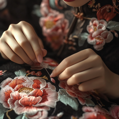 A craftsman is performing Su Embroidery, and the camera focuses on her hand movements and delicate embroidery patterns. The pattern is peony.The overall atmosphere is Chinese style, which has a thick charm.