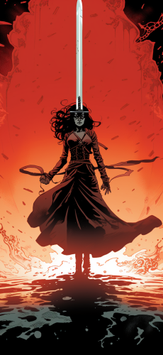 demonic heroine claiming sword of power held in hands, in comic book style of Mike Mignola --ar 6:13