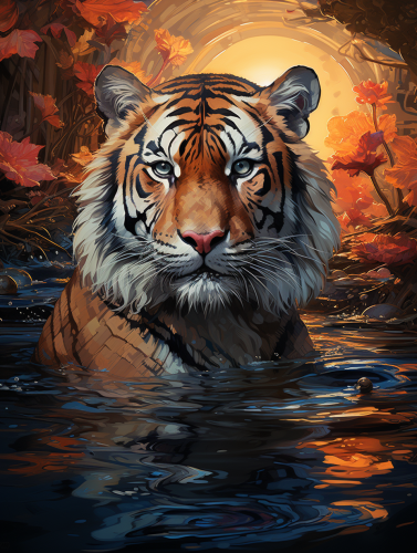crazy fine art, little psyche, anime and cartoon art, tiger in a boat, quiet waters, sunset, wide angle, bright colors, ultra detailed, realistic --ar 3:4
