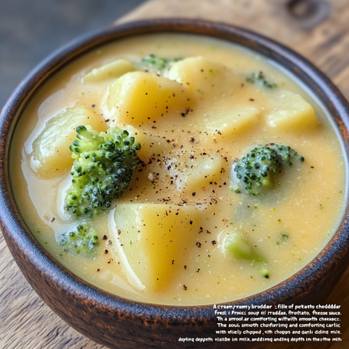 "A creamy bowl of potato broccoli cheddar soup, filled with tender chunks of potato, fresh broccoli florets, and a rich, melted cheddar cheese sauce. The soup is smooth and comforting, with finely chopped onions and garlic visible in the mix, adding depth to the dish. Lightly sprinkled with black pepper, the soup has a golden yellow hue from the cheddar, with hints of green from the broccoli. Presented in a rustic bowl, under warm, soft lighting to emphasize the hearty, warming appeal of this classic comfort soup."