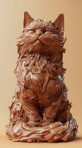A lifelike cat sculpted entirely from Kinder Bueno bars. The cat should have realistic details and textures resembling the creamy and crunchy elements of Kinder Bueno, with a smooth, chocolatey exterior and hints of the hazelnut filling. The cat should appear both appetizing and realistic, blending the visual appeal of the confectionery with the natural features of a cat.