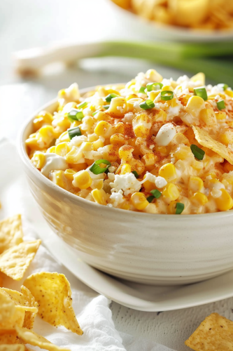 Snap a 4K photo that looks super real and makes your mouth water. Picture a creamy corn dip, made with sweet frozen corn mixed with soft cream cheese and spicy pepper Jack cheese. Add in Colby Jack cheese for extra meltiness, sour cream for tang, and a dash of hot sauce for a little kick. Sprinkle in sliced green onions, garlic powder, cumin, salt, and pepper to make it all pop with flavor. Imagine this cheesy, creamy dip served warm, perfect for scooping up with crunchy corn chips. Place the bowl of dip on a white plate on a clean white table, making sure it's the star of the show with nothing else in the background. It should look so creamy and cheesy, you'd want to dip a chip right into the photo. Make sure to use natural light --ar 2:3