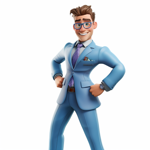 Male adult muscled in light blue suit from the netherlands with glasses and brown hair as a 3d pixar-style character on solid white background