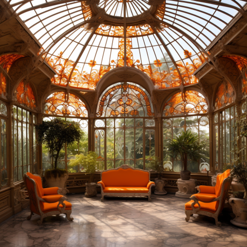 design art nouveau orangery, pomerangate, orange, big windows, fontains, angels 16:9
