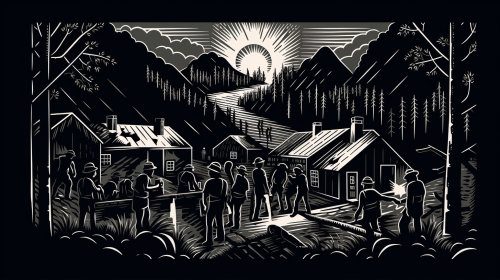 Coal miners in the 1940s. Black and white. Lino stamp. Antique. Retro graphics at night --ar 16:9