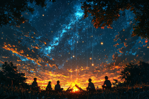 high quality, 4K, photo realistic scene of a galaxy night sky filled with stars, below the sky is a village with people sitting around a campfire telling stories, pointing at the night sky. --ar 16:9