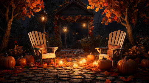 Cozy two armchairs and campfire in the middle, Halloween decoration, string lights in the autumn forest, a lot of pumpkins and autumn leaves and campfire, halloween pumpkins, sharp, very realistic, unreal engine 5 --ar 16:9