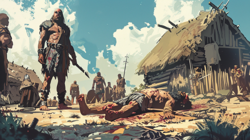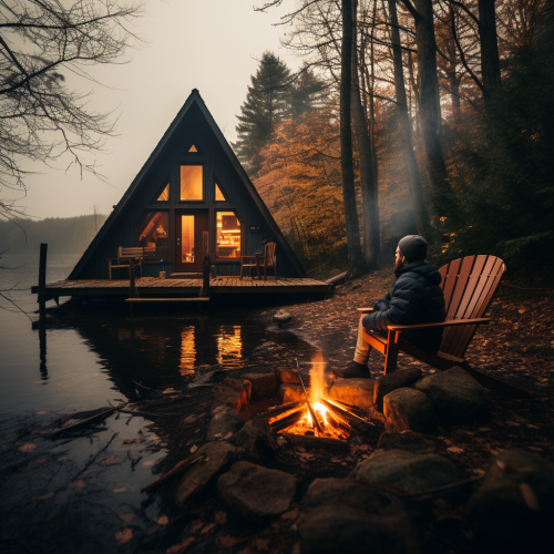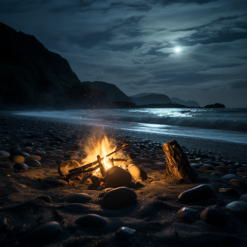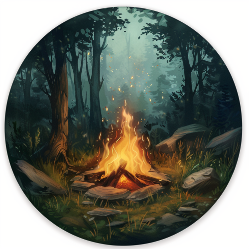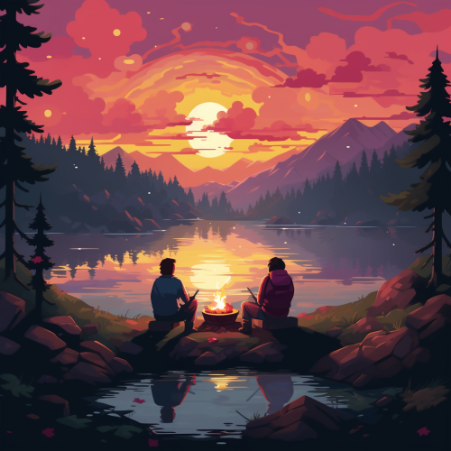 Create a pixel art scene of the two men sitting by the campfire with their guksis. The lake and the surrounding nature could also be pixelated, giving the whole design a nostalgic, video game-like feel.