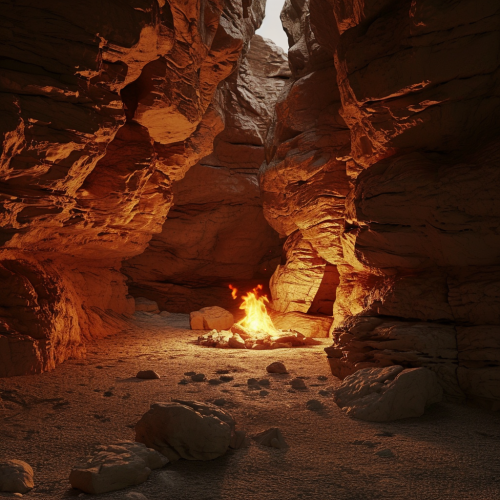 a cave with a small campfire. The cave is composed of red sandstone featuring highly detailed and intricate geologic formations. Soft lighting, volumetric lighting, highly detailed textures, photorealistic. --v 6.0