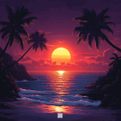 Create a vibrant banner with a beach sunset scene, palm trees, and tropical colors suitable for a SoundCloud deep house profile background. The view should capture an open sky and ocean waves in a relaxed, atmospheric style. –ar 5:1 --s 750